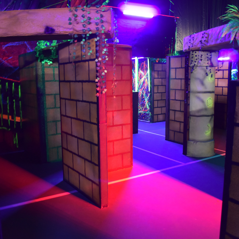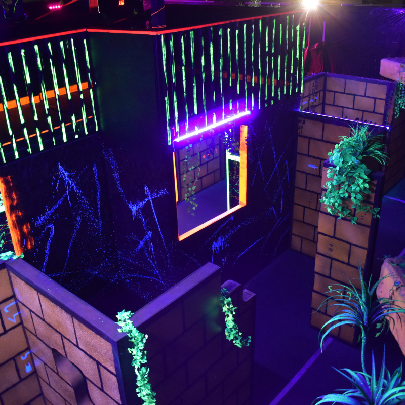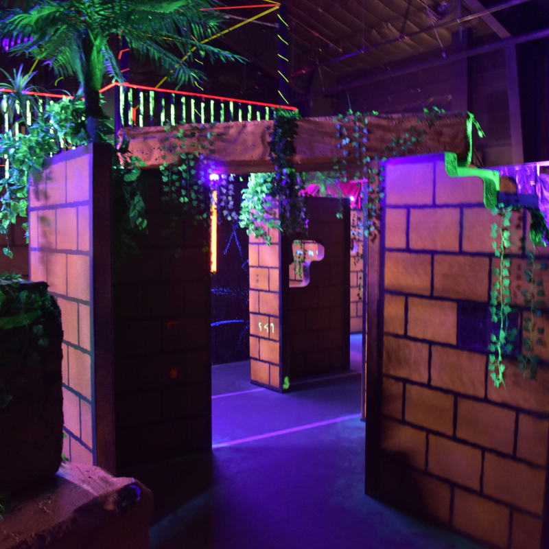 Outer space. Into the future. The post-apocalyptic world. Where it takes you is up to you! Playing laser tag at the area’s largest facility will transport your party to a different time and place, where shelters are obstacles, and vantage point viewing could be catastrophic. This blackened unlit space, marked only by glowing graphics, is the perfect setting for a friendly family rivalry, a high school after-hours, a scouting troop field trip, a team-building corporate retreat, or a birthday bash. At Funagin’s we make sure you have everything you need to be armed and dangerous in our laser tag field. Vests, phasers, and all the mazes, obstacles, and hiding places you want!